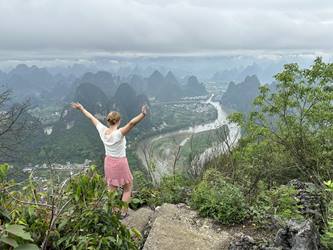 Na het ontdekken van indrukwekkende steden kwamen we aan in Yangshuo, waar karstbergen uit het landschap oprijzen. Het is zonder twijfel voor mij één van de mooiste plekken van China. Yangshuo nodigt uit tot avontuur en mooie activiteiten, maar mijn meest bijzondere herinnering is de scootertocht door het landschap. Rijdend over de rustige wegen kon ik volop genieten van het adembenemende uitzicht om me heen. Onderweg ontdekten we een verborgen waterval, stopten we bij een karstberg en klommen we deze omhoog. Boven wachtte een spectaculair panorama: een zee van groene karstbergen met de slingerende Li-rivier er tussendoor. Het was een moment om nooit te vergeten.